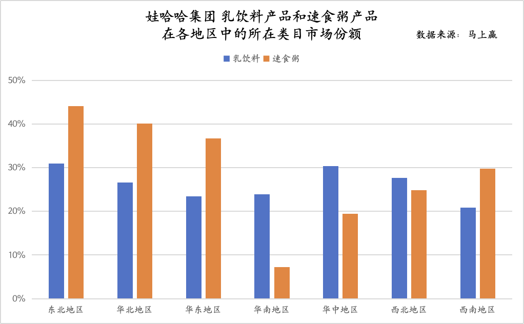 在娃哈哈占比较高的乳饮料与速食粥类目的地区分布差异上,相比来说,速食粥产品在东北地区、华北地区与华东地区较高,乳饮料则在华中、东北、华北地区较高。另一个需要关注的点是,娃哈哈速食粥系列产品在华南地区的市场占有率远远低于其他地区,可能与区域的口味习惯等相关性较强,乳饮料则在全国较为平均,未展现出在某一地区远远高于/低于平均水平的情况。