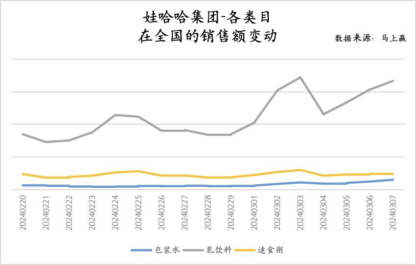 通过日级别数据可以看到,一方面,乳饮料类目在整个集团的线下零售销售额中依然占据主导地位,领先其他类目较多;同时,自2月25日事件发生后,经过几天的发酵,娃哈哈产品在乳饮料类目中的销售确实有较为显著的增长,包装水类目也略微有一些拉升,速食粥则变化不大;