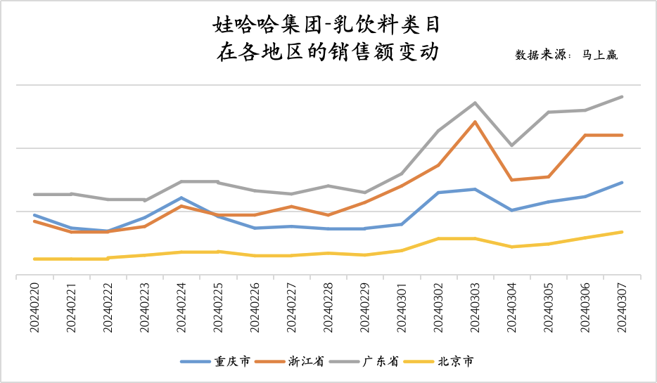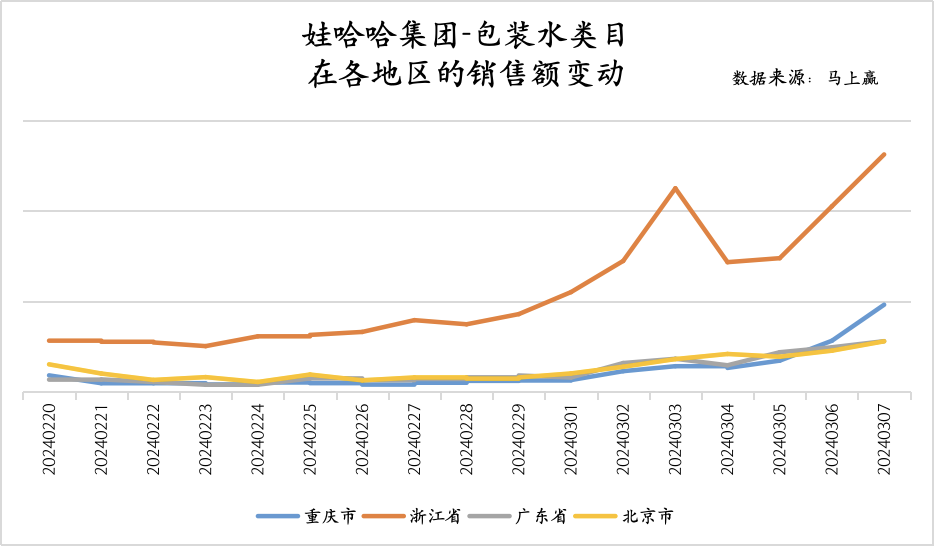 作为娃哈哈销售额占比过半的重点类目,乳饮料的事件波动影响在各类目中最大,可以看到,在事件发生后的各样本地区均有较大幅度的拉升,其中广东、浙江变动较大,重庆、北京变动相对来讲较小;