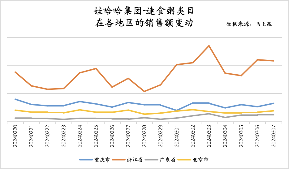 速食粥类目则与上述饮料与包装水类目的情况不同,可以看到,自0225事件发生以来,浙江有波动但其振幅较大,与事件的相关性可能不如上述两个类目相关性高;除浙江的其他三个地区基本变动不大,较为平稳;