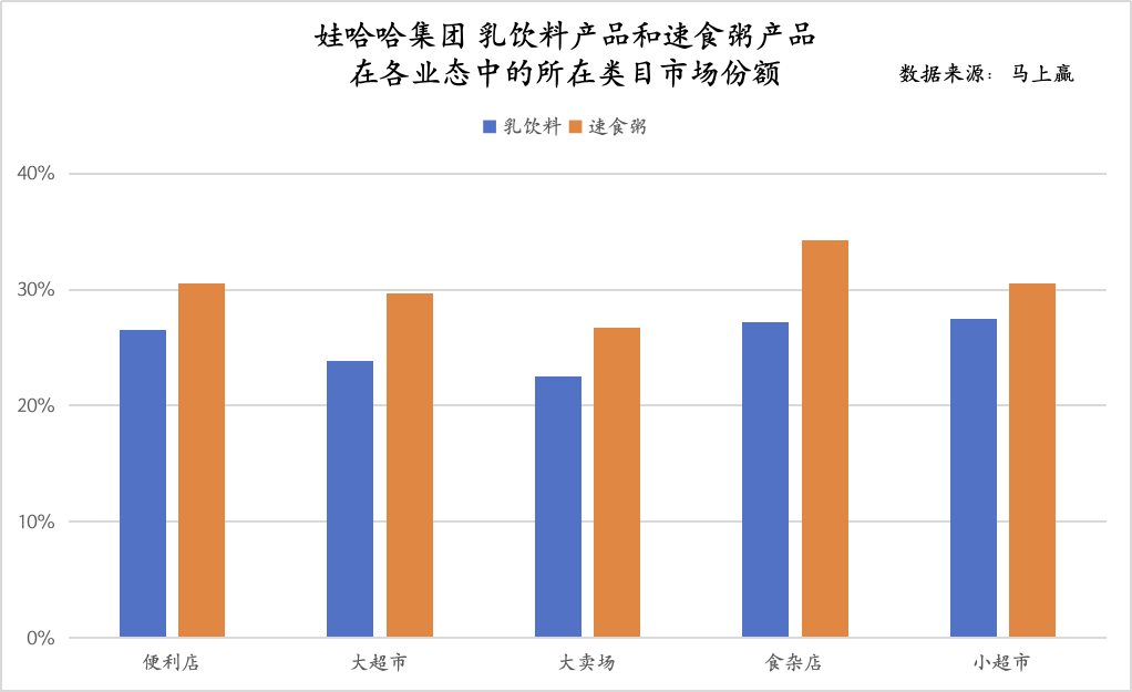 在娃哈哈占比较高的乳饮料与速食粥类目的业态分布差异上,整体基本平均,未有很明显的差异性。