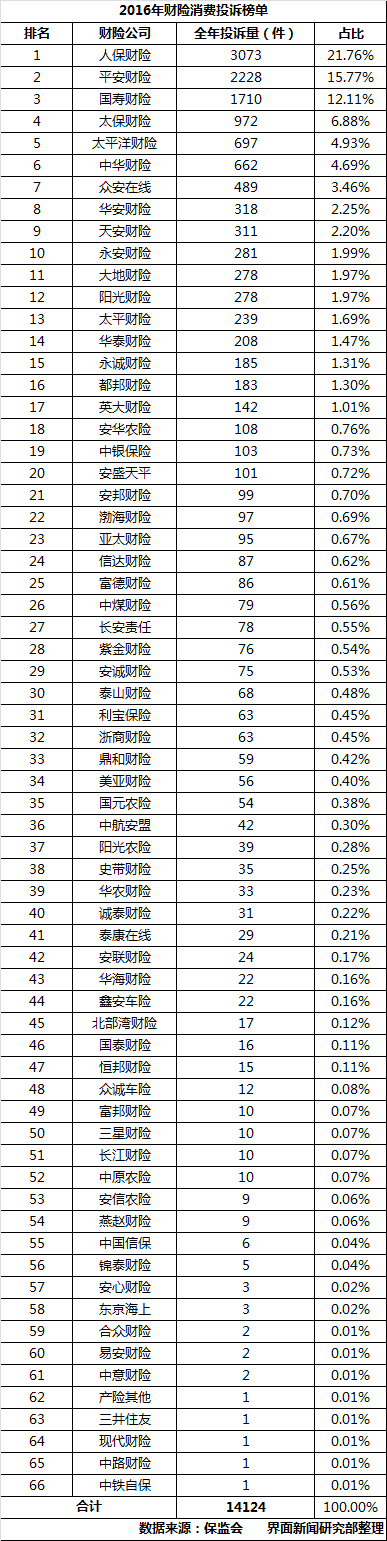 随着12月消费投诉结果的公布,2016年全年财险公司投诉情况也清晰可见。界面新闻整理1-12月消费投诉量,做出了2016年财险公司投诉榜单。