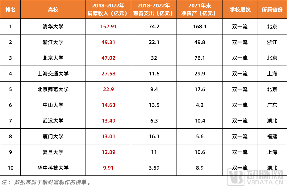 图1. 2018-2022年获得捐赠收入TOP10的国内高校(数据来源:新财富)