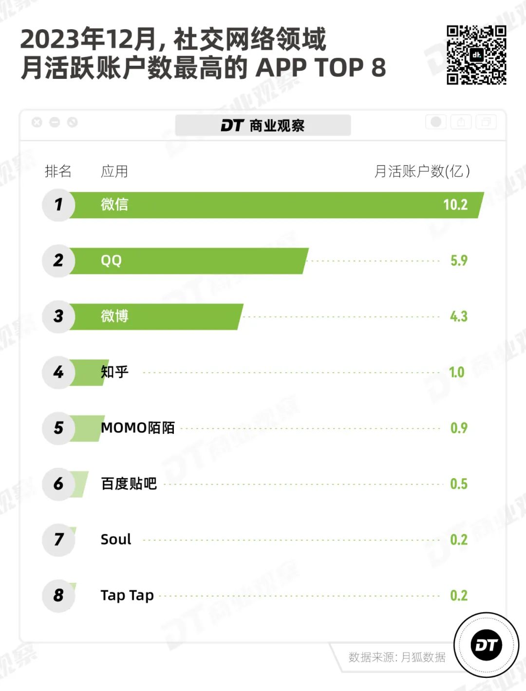 根据月狐数据2023年12月的统计,QQ月活跃账户数比微博和知乎加在一起还要多,达到5.9亿。