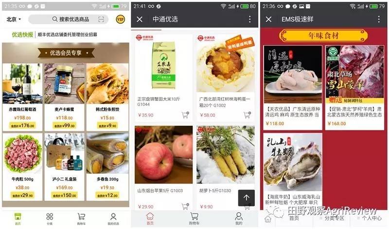 (顺丰优选、中通优选、EMS极速鲜手机商城主页,可见选品和设计都有很多硬伤)