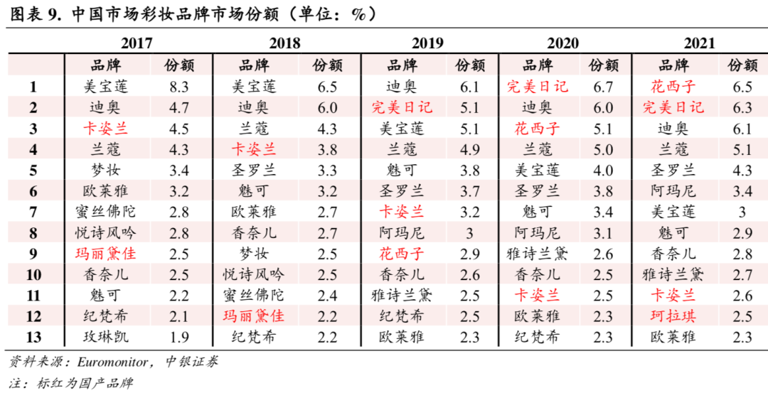 完美日记被正式推出在2017年,也正是从这一年开始整个国货美妆行业高歌猛进。百雀羚和自然堂在2017年天猫双11榜单上名列前茅,到了2019年有589个国货美妆品牌在天猫618当日成交额同比增长超过100%。2021年时,花西子和完美日记已拿下中国彩妆市场品牌市占率TOP1和TOP2,超越海外品牌。
