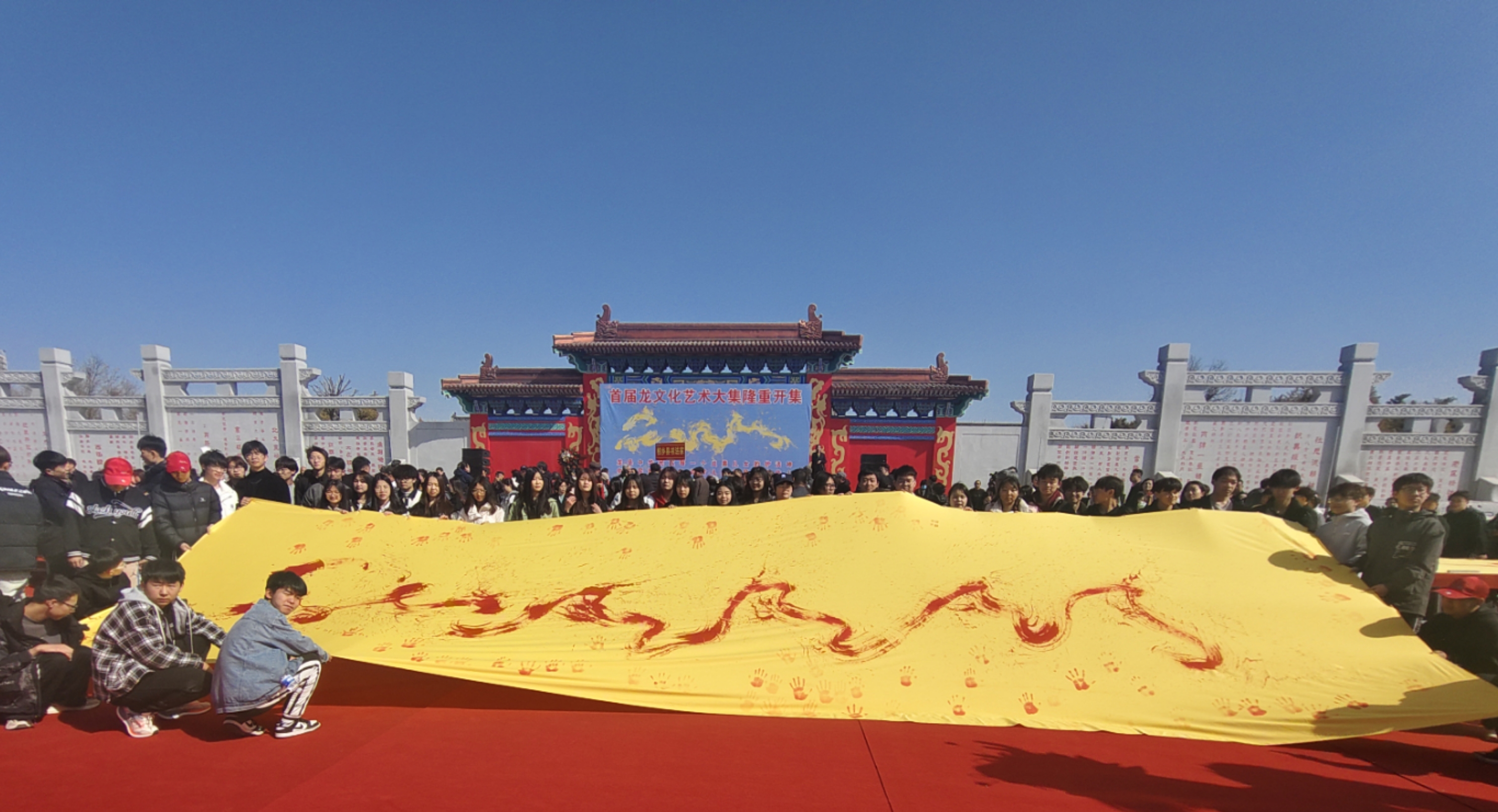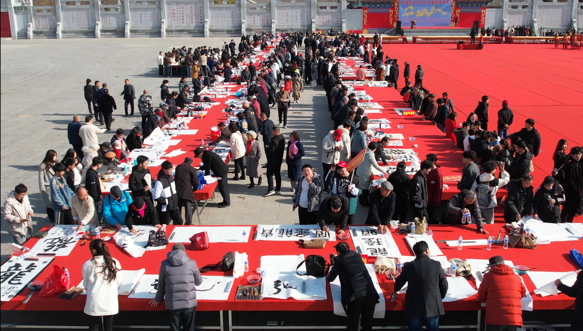 今天的开幕式“群贤毕至,少长咸集”:有10余名国家级书法大家名家、700余名石家庄各县书法家、300余名河北美院、河北经贸大学等学生代表及社会各界人士。大家齐聚一堂,共襄盛举,千人共同书写“龙”字,现场气氛隆重热烈。当任智需先生书写的三幅巨幅“飞龙”完成之后,众人纷纷在“飞龙”作品上留下掌印,为首届龙文化艺术大集开幕式留下了最珍贵的一幅墨宝。千人千幅“龙”字作品伴随巨幅“飞龙”的一同展示,再伴以舞龙表演穿插其中,将现场氛围推向至最高潮,龙文化深厚庄重、穿越古今、跨越天地的气势展露无遗,一场文化新纪元在此刻正式开启。