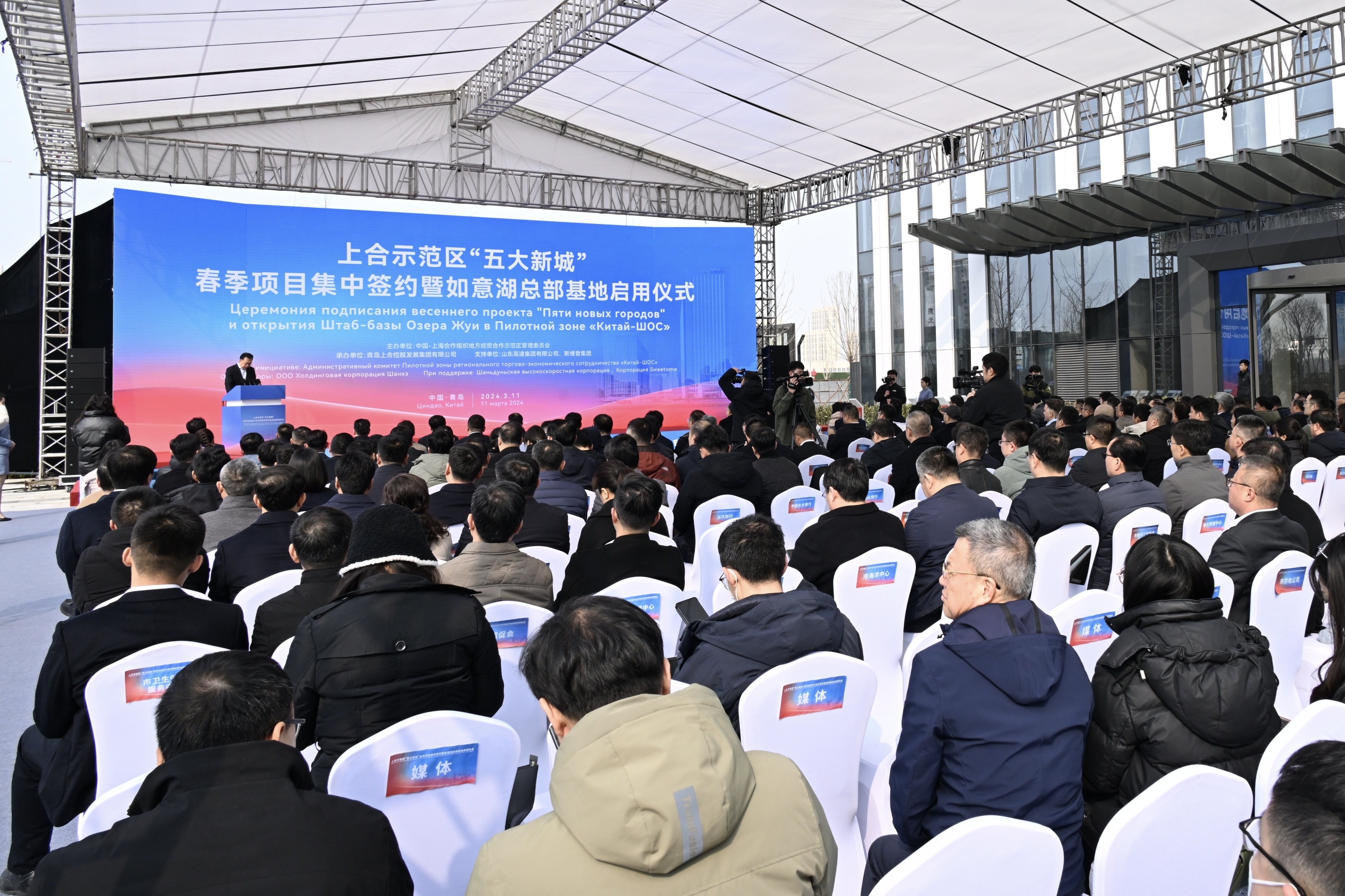 为贯彻落实全国“两会”精神、山东省高水平开放暨高质量招商引资大会和省《关于支持上合示范区高质量发展的意见》精神,深入实施上合示范区扩能行动、加力打造高能级开放平台的重点支持项目,全面启动上合国际城建设,推动“五大新城”建设提速起势,3月11日,上合示范区“五大新城”春季项目集中签约暨如意湖总部基地启用仪式在如意湖总部基地举行。
