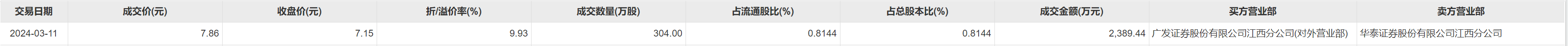 金花股份3月11日大宗交易成交304万股,成交额2389.44万元,占当日总成交额的68.09%,成交价7.86元,较市场收盘价7.15元溢价9.93%。