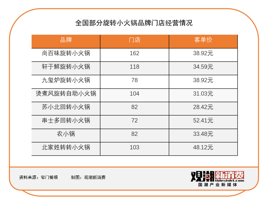 沉寂已久的旋转小火锅也再度走红,盛香亭转转热卤、苏小北回转小火锅、农小锅等品牌在2023年异军突起,部分品牌门店已突破百家。