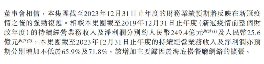2023年业绩预告显示,海底捞2023年营收和净利润较2019年将分别增长65.9%及71.8%以上,已经超过疫情前的业绩水平。