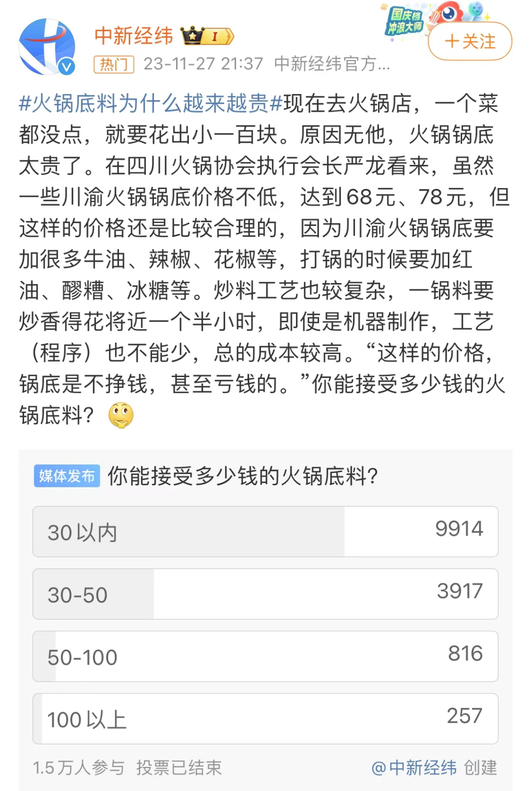 中新经纬曾在微博发出调查:你能接受多少钱的火锅底料?1.5万人的投票中有近1万人认为底料应该在30元以内,只有不到1000人认为火锅底料应该在50元以上。