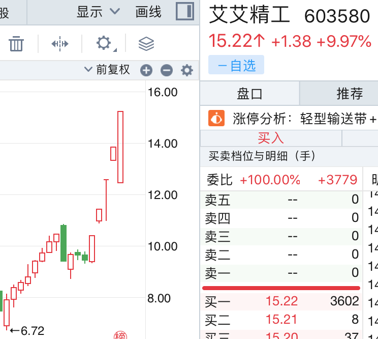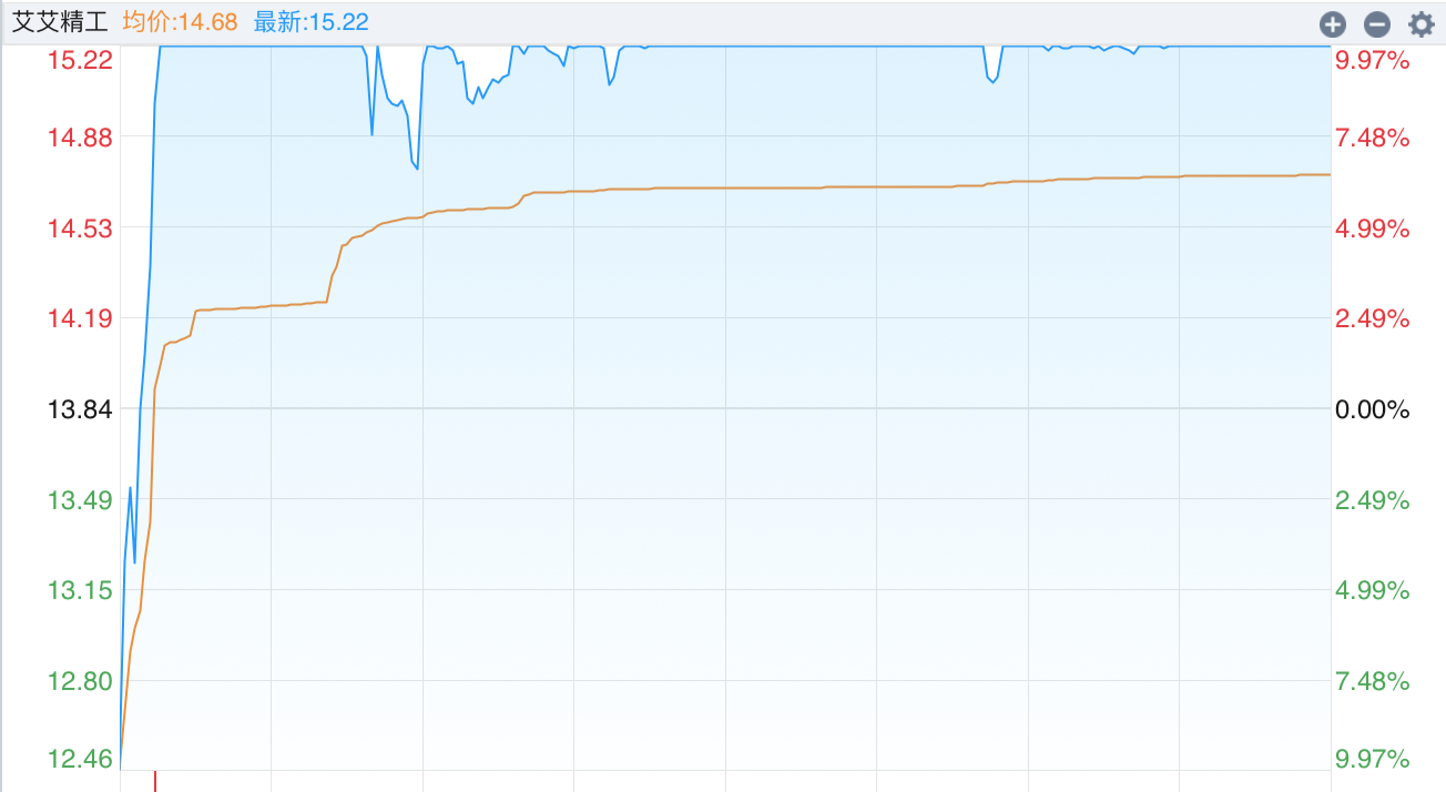 从3月11日的盘面来看,艾艾精工12.46元开盘,开盘即刻被买单拉起,在短短8分钟里,就拉到了涨停价位。由于3月8日的收盘价为13.84元,可以说艾艾精工的第五个涨停是以“地天板”的姿态完成的。