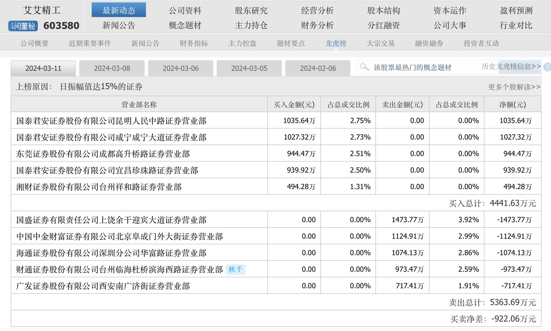 不过值得注意的是,虽说3月11日艾艾精工完成涨停,但盘中却多次开板,筹码锁定不稳,全天的换手率达到了19.55%,收盘时涨停板位置也只有3602手买单在排队。其龙虎榜显示,当天买卖前五都是游资。买入较多的是国泰君安昆明人民中路营业部和国泰君安咸宁咸宁大道营业部,买入金额均超过了千万元;卖出席位中国盛证券上饶余干迎宾大道营业部、中国中金财富北京阜城门外大街营业部、海通证券深圳分公司华富路营业部的卖出金额也都上了千万元。尤其是买卖前五的净差为-922.06万元。