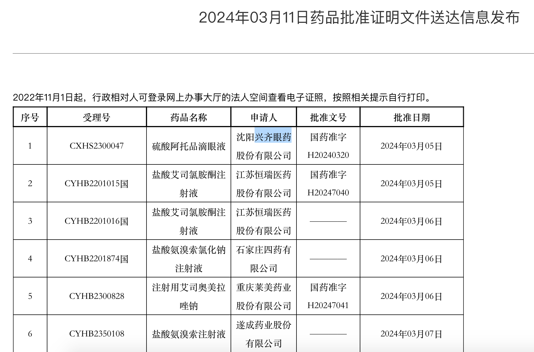 界面新闻在药监局官网上看到,3月11日药品批准证明文件送达信息发布中,共涉65种药品,其中兴齐眼药的硫酸阿托品滴眼液排在第一个,批准日期为2024年3月5日。
