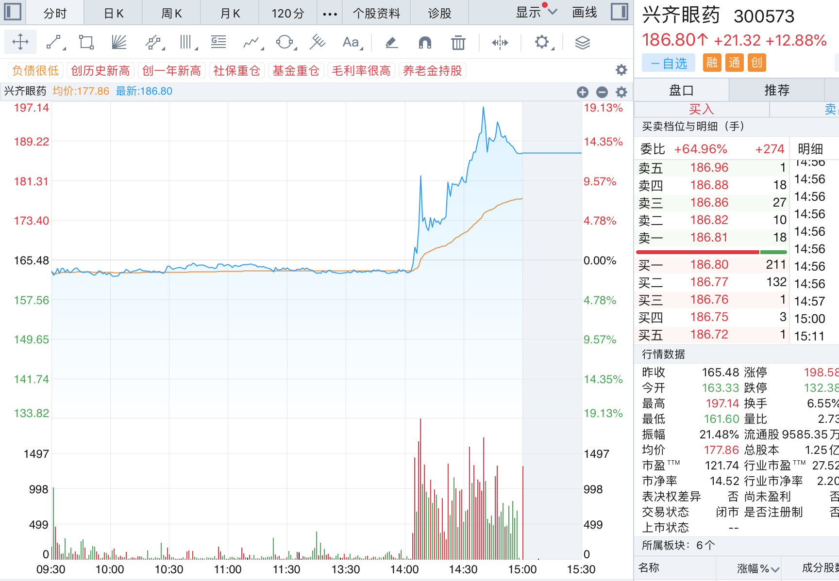 盘面上,兴齐眼药尾盘也是获得大量做多力量的追捧,涨幅一度拉至19%上方,收盘时兴齐眼药的涨幅为12.88%,收盘价186.8元,全天换手率6.55%,截至收盘时总市值达233亿元。