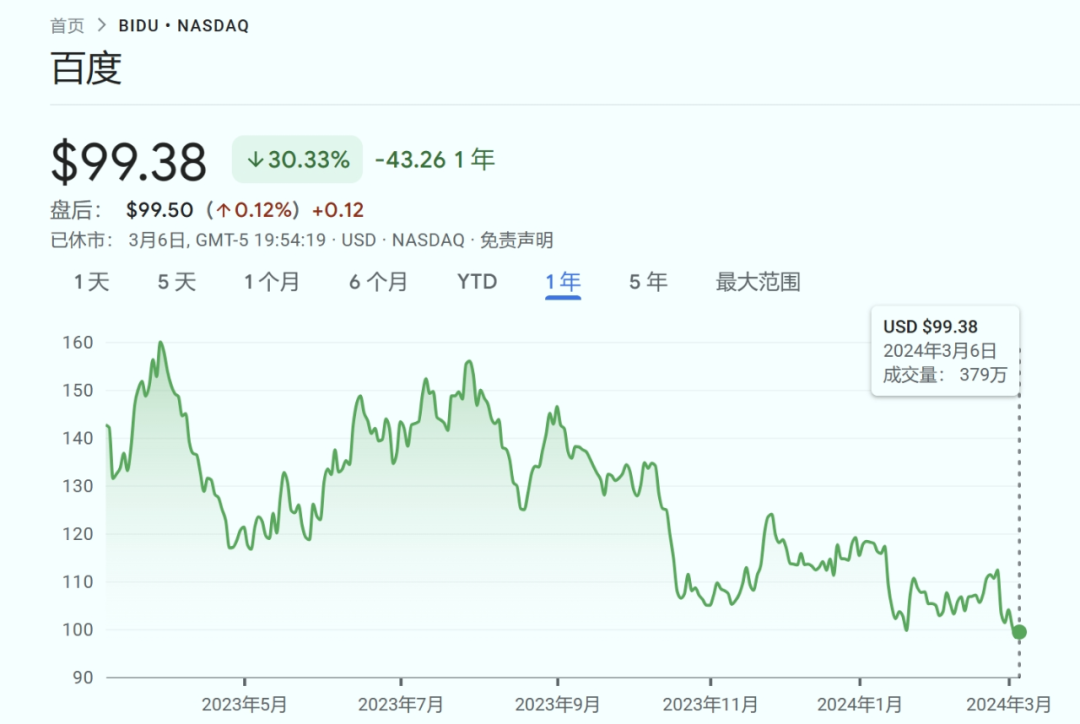 整体来看,过去一年百度市值的跌幅超过 30%,文心一言以及百度在大模型、社区、开发者生态等方面的布局,并未对市值产生太大的拉升作用,甚至成了股价下跌的负面因素。
