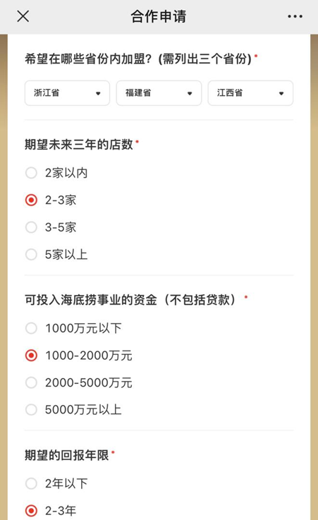 海底捞官网已经开辟了“加盟合作”入口,简要介绍了加盟流程、支持政策,以及加盟要求等。想要申请加盟,首先需要扫描页面的二维码,填写信息,包括拟加盟地区、个人资产及收入情况、期望回本周期、手头是否有物业、是否有行业经验、个人学历及工作经验等。但并未明确对资金量的要求、以何种方式开放加盟等核心信息。