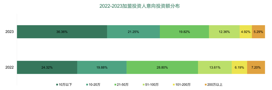 成本的增加会拉长回本周期。中国特许加盟展及盟享加发布的《2023加盟投资人群洞察报告》显示,盈利模式、回本周期、行业发展前景是影响投资人加盟决定的三大关键因素。投资人倾向于更灵活可控的小店加盟,20万元以下的小额投资占比明显增加,占比近六成。