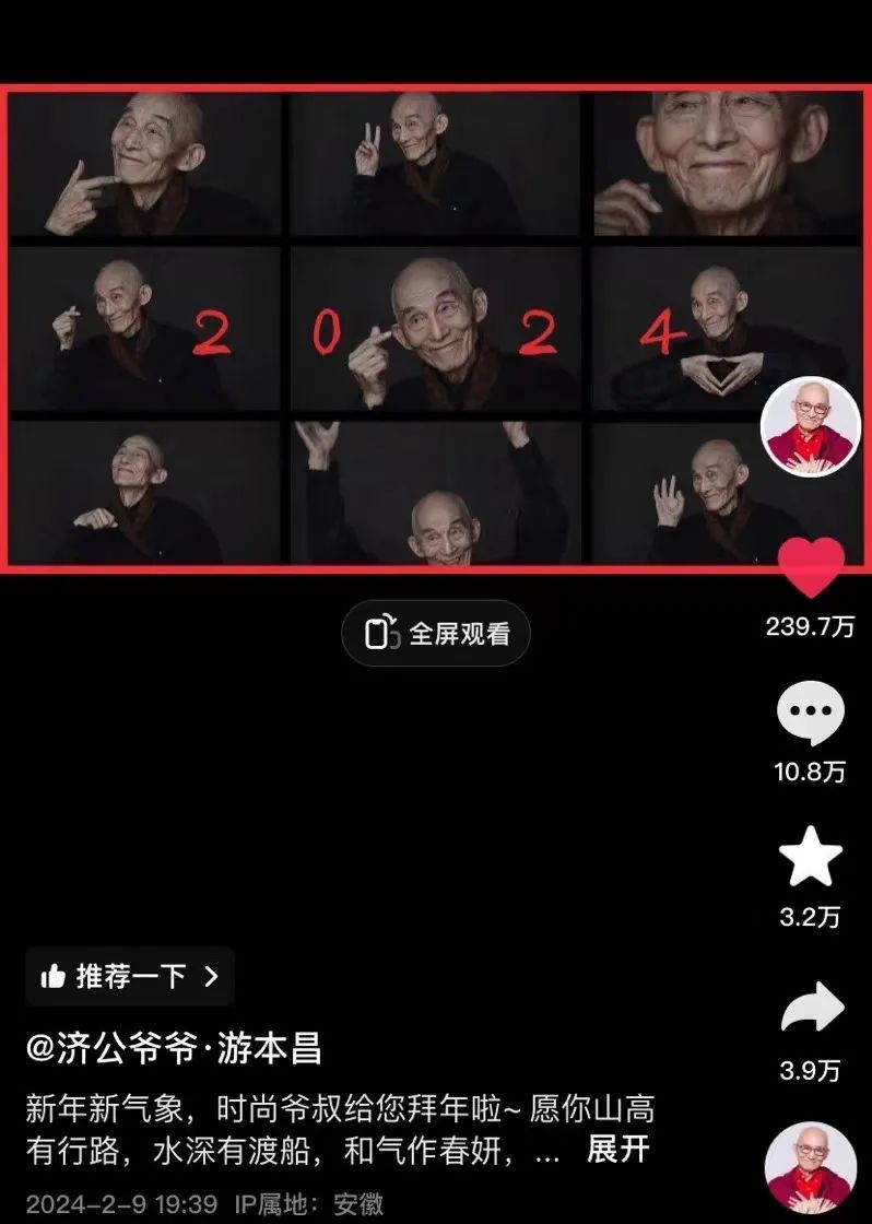 今年因《繁花》再度进入观众视野的“时尚爷叔”游本昌,在春节祝福视频中灵活地玩起了“比心”手势,得到了不少年轻网友的关注,视频点赞超200万。