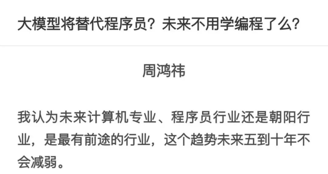 3月10日晚,周鸿祎就驳斥道:“大模型将替代程序员?未来不用学编程了么?我认为,程序员热十年内不会减弱。尽管未来人人都会用电脑,所谓人人都是程序员,但不同的人用电脑创造的产品完全不一样,AI 时代更需要计算机专家和程序员,他们可能是各行各业最有发言权的。”