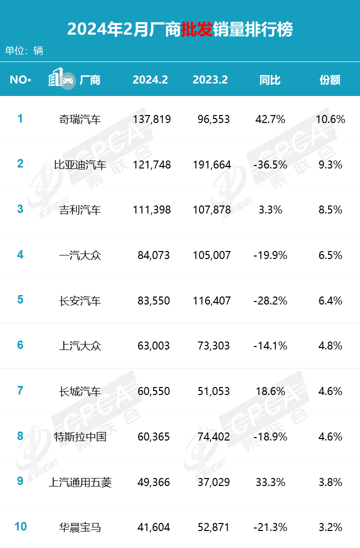 2月乘用车批发量超过10万辆的,刚好就是前三。