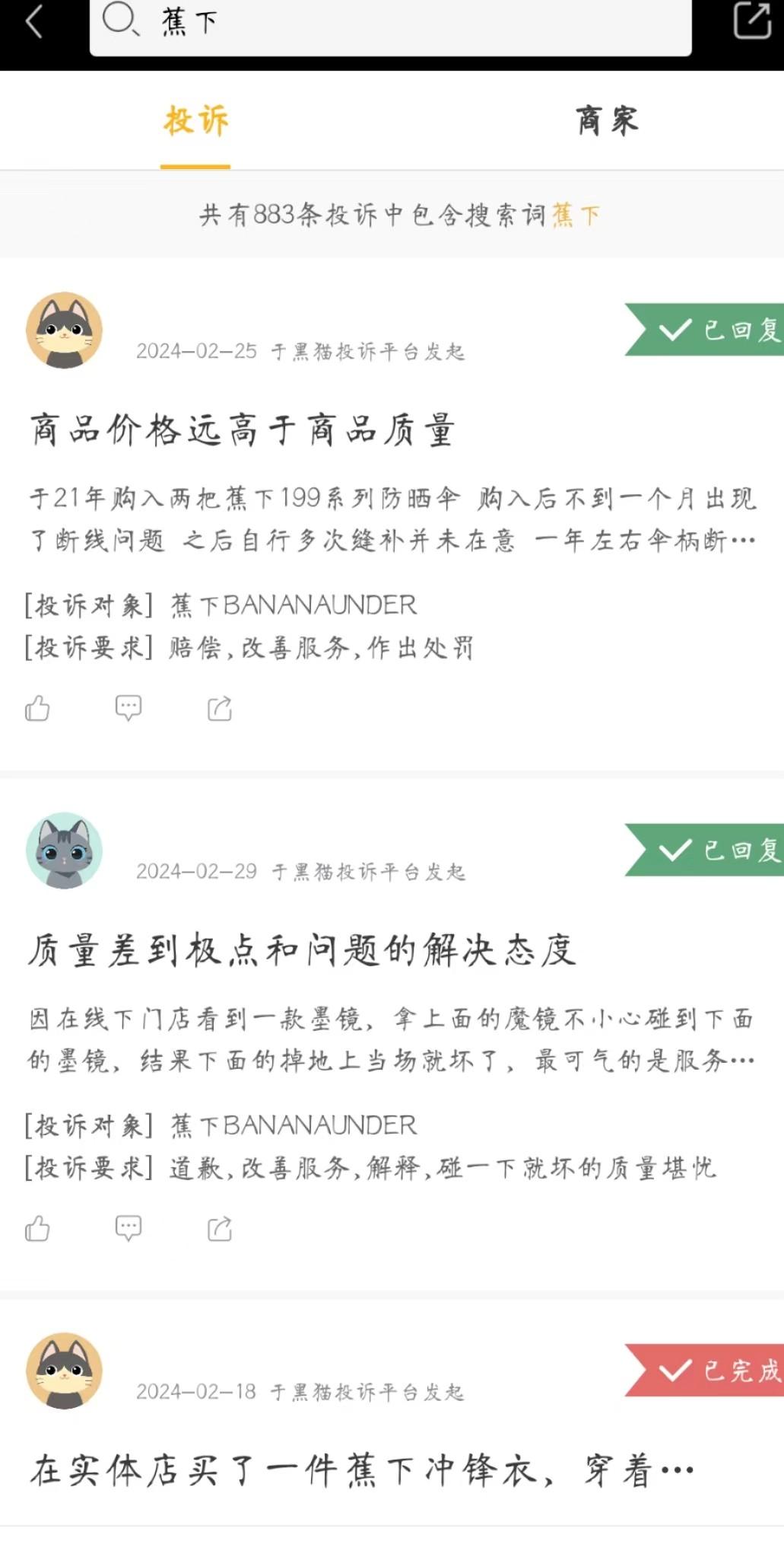 与此同时,在消费市场上,另一家国产新晋网红品牌“蕉下”的质量口碑似乎也不算好看。