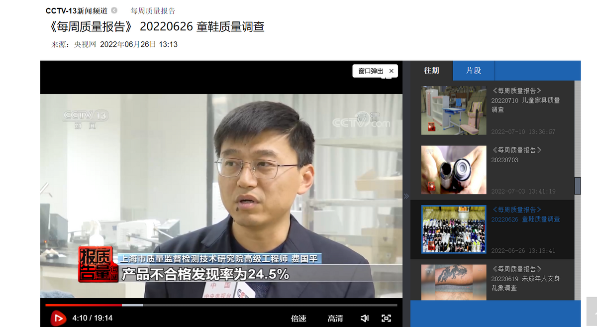 但这还没完,2022年6月央视网的《每周质量报告》栏目,再一次揭露了童鞋背后的风险,这一次童鞋不合格占比率高达24.5%,共有48批次童鞋被查出邻苯二甲酸酯超标。