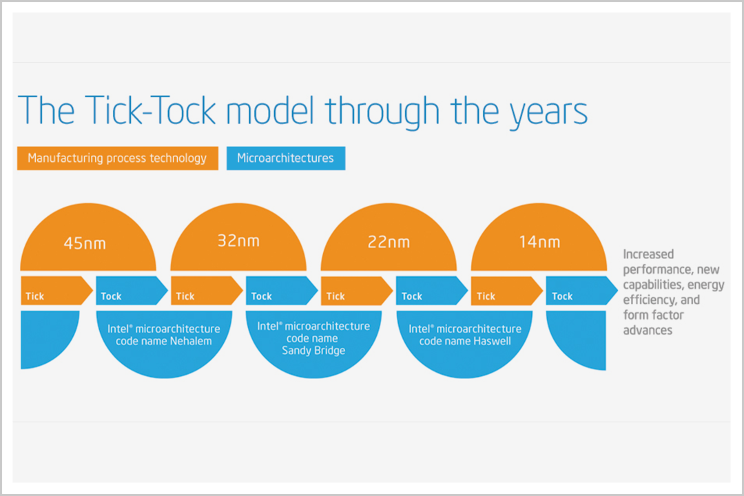 2005年到2007年,英特尔又推出了独特的Tick-Tock生产模型,即以两年为轮换单位,“tick年”侧重芯片制造,更新芯片制程、提升工艺;“tock年”侧重芯片设计,革新架构。