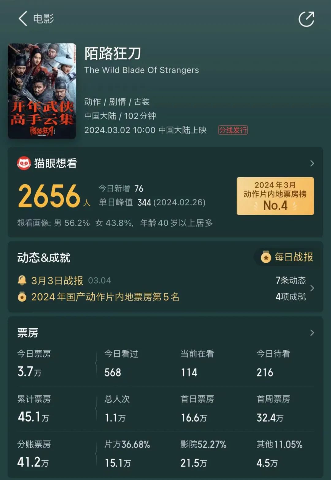 日前,爱奇艺出品的古装武侠电影《陌路狂刀》官宣将于3月8日在爱奇艺云影院上线。不说还好,再一看这部影片早在3月2日便已经提前登陆院线市场。不过就像之前的分线发行影片一样,上映将近一周时间,《陌路狂刀》累计票房仅不足50万元。
