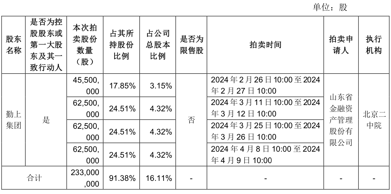 根据公开信息,拍卖执行机构为北京市第二中级人民法院,拍卖申请人为山东省金融资产管理股份有限公司(以下简称“山东金资”),拍卖共分四次完成,2月26日10点至2月27日10点为第一轮拍卖,涉及筹码4550万股,占公司总股本比例3.15%;第二轮时间为3月11日10点至3月12日10点,涉及筹码6250万股,占比4.32%;第三轮时间在3月25日10点至3月26日10点,涉及筹码6250万股,占比4.32%;第四轮时间为4月8日10点至4月9日10点,同样是6250万股。至于拍卖原因,则是因山东金融资管向北京二中院申请执行李旭亮、温琦、勤上集团民事一案。