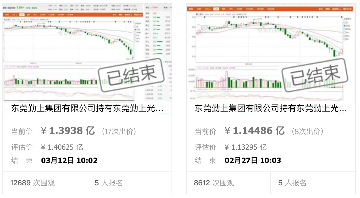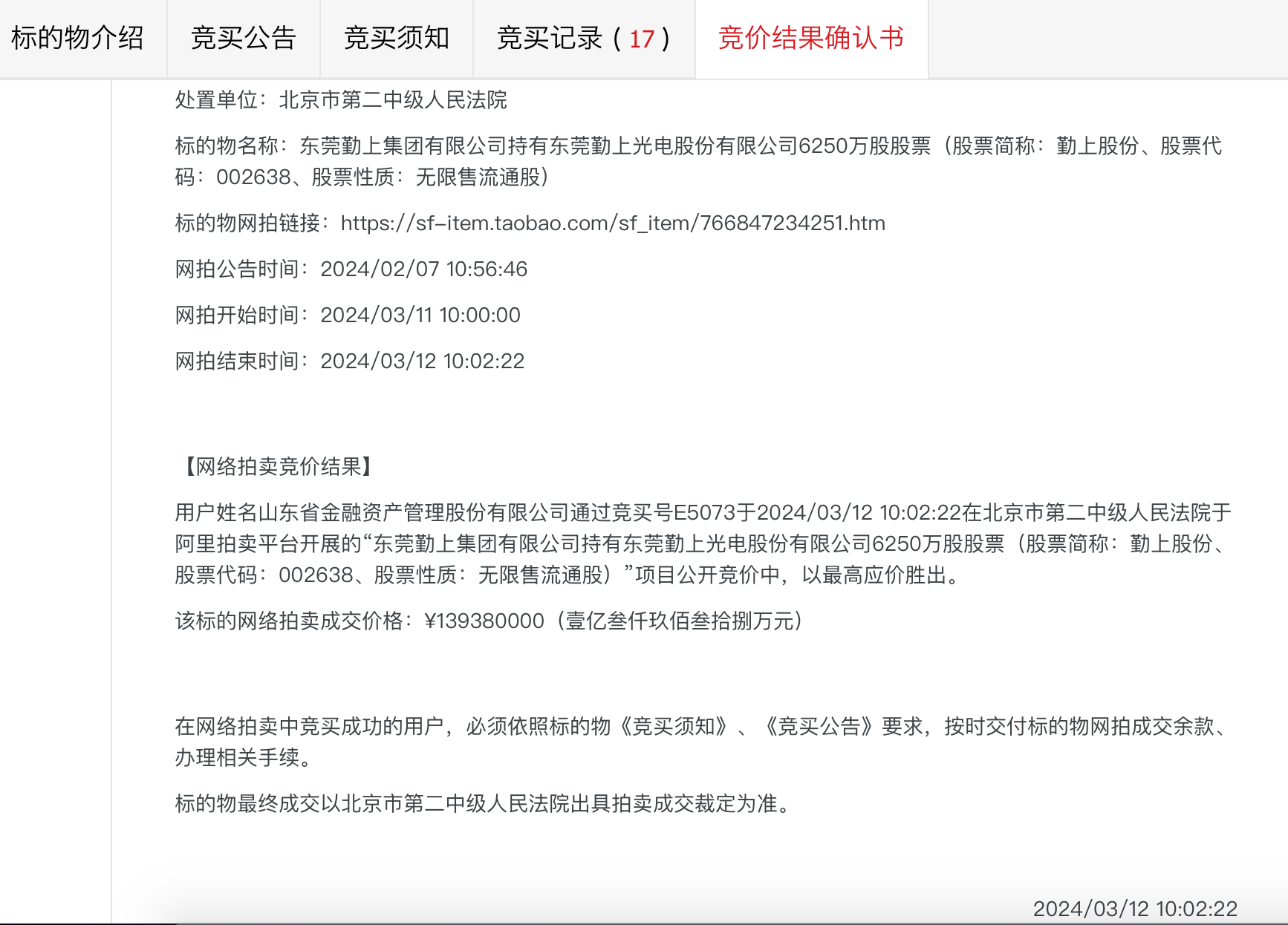 2月28日勤上股份披露,这第一轮的4550万股,已在阿里拍卖平台完成拍卖,由山东金资通过竞买号V8015在公开竞价中,以最高应价胜出,拍卖成交价为1.14亿元,成交均价约为2.52元/股。