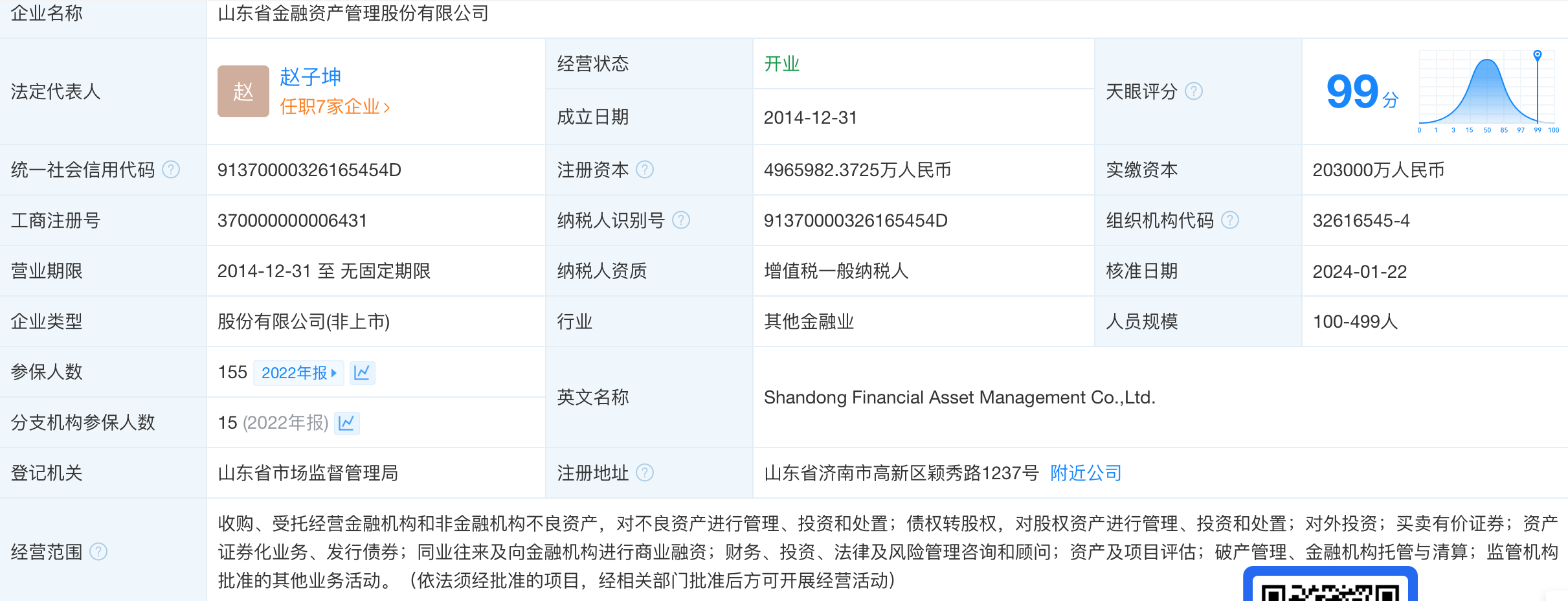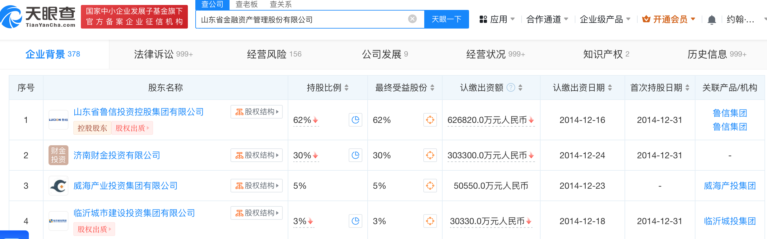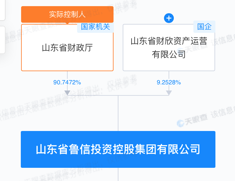 根据天眼查显示,山东金资成立于2014年12月31日,注册资本496.6亿元。山东省鲁信投资控股集团有限公司持有山东金融资管62%的股权,济南财金投资有限公司持股30%,威海产业投资集团有限公司持股5%,临沂城市建设投资集团有限公司持股3%。而山东省鲁信投资控股集团有限公司则由山东省财政厅持股90.7472%,由山东省财欣资产运营有限公司持股9.2528%。