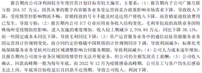 在2022年年报中,广脉科技解释称主要系报告期内公司数字内容服务业务受运营商竞合政策市场需求下降及疫情防控物流不畅等原因。