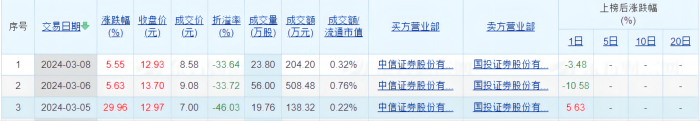 据悉,这3笔大宗交易的买方均为中信证券股份有限公司杭州古墩路证券营业部,卖方均为国投证券股份有限公司上海普陀区江宁路证券营业部。