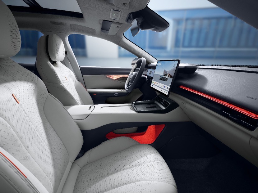 座椅中央吊坠、门板、中央扶手箱等多处采用极简撞色设计,以亮橙色点缀白色内饰,凸显座舱运动感的同时,提高整车的精致感。扶手箱中央定位绗缝处带有经过PVD处理的彩色装饰点缀,灵感来源于奢侈品牌的手袋、箱包等设计,让整车内饰质感更高级。