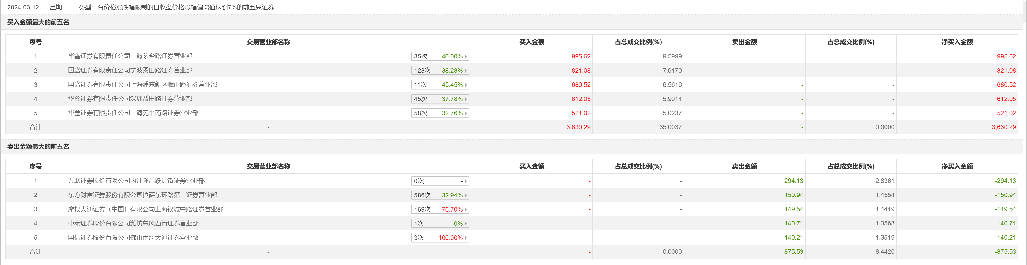 3月12日,大理药业今日涨停,龙虎榜数据显示,上榜营业部席位全天成交4505.83万元,占当日总成交金额比例为43.45%。其中,买入金额为3630.29万元,卖出金额为875.53万元,合计净买入2754.76万元。