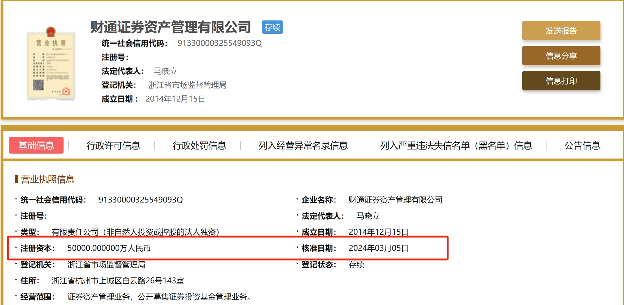 国家企业信息网显示,财通证券资产管理有限公司(下称:财通资管)于近日完成增资,注册资本由2亿元增至5亿元,核准日期为3月5日。