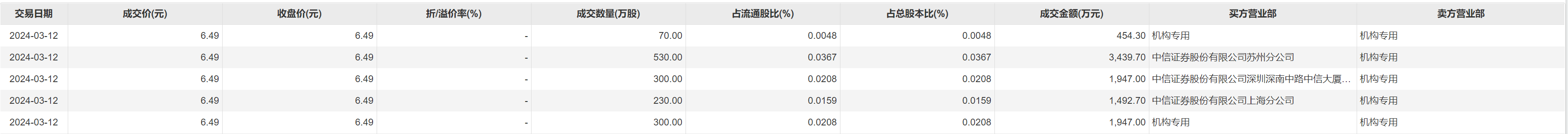分众传媒3月12日大宗交易成交1430万股,成交额9280.7万元,占当日总成交额的8.31%,成交价6.49元,较市场收盘价6.49元持平。