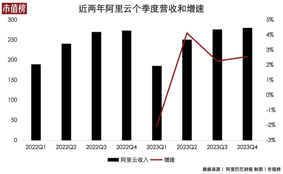 而在不到一年之前,阿里云已经进行过一次“史上最大”降价。接下来的两个季度,阿里云的收入增长只有2%和3%,并没有预期的起飞,从去年四季度来看,去掉阿里的贡献,收入还出现了下降。