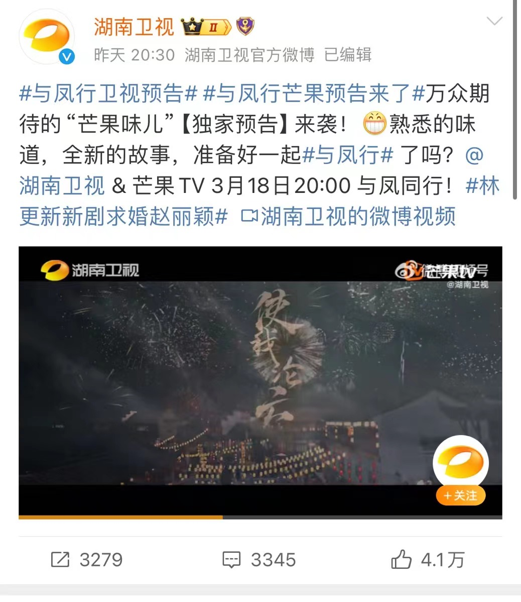 光定档就是一出大戏。3月7日,《与凤行》北美定档的消息率先传来;8日晚,湖南卫视右下角的广告“暴露”了国内播出时间,也拉开了两大播出平台鹅和芒果的深夜喊话battle;9日早,定档信息正式官宣,“商战”也在持续升级。