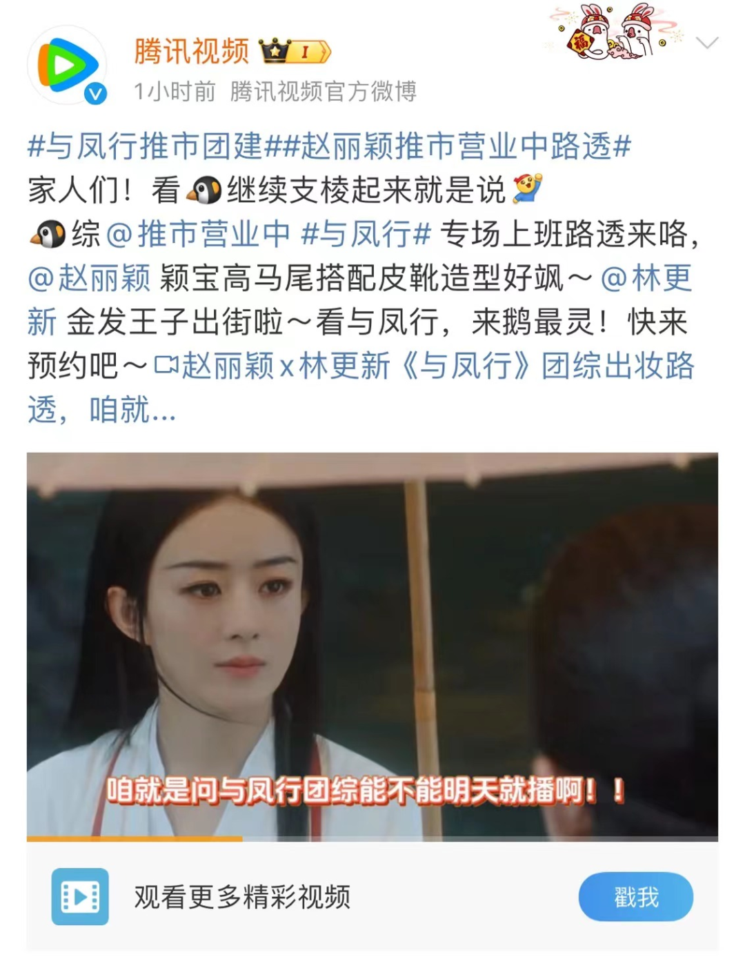 腾讯视频则主打一个“家大业大”,不仅有剧集片单,还联动腾讯电影推出了赵丽颖电影片单、进行《第二十条》的抽奖福利。今日晚间,鹅厂综艺《推市营业中》中还推出了“与凤行专场路透”,据了解这是腾讯视频推出的剧综联动综艺,可以解读为这是《与凤行》的团综。