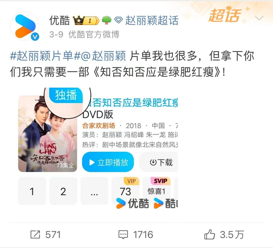 虽非播出平台,优酷和爱奇艺也在火速加速“商战”。刚刚在去年底因为《知否知否应是绿肥红瘦》独播权大赢一把的优酷,不仅推出了赵丽颖片单,更是喊话“拿下你们我只需要一部《知否》”。爱奇艺同样在剧集板块上线了赵丽颖作品合集。