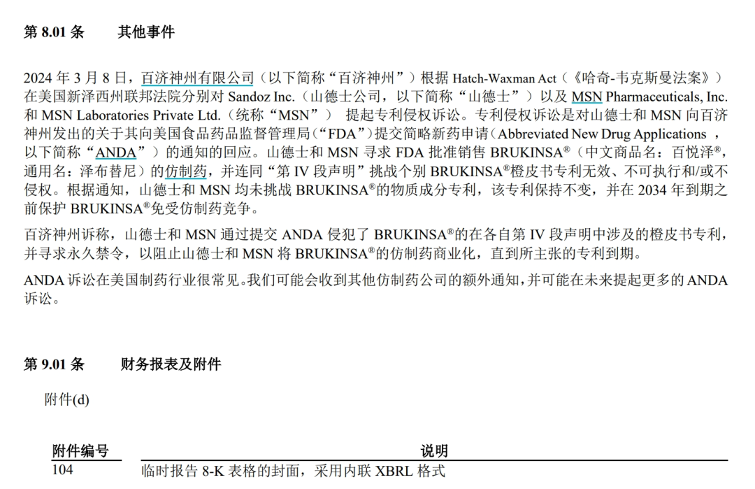 百济神州在披露诉讼的公告中,提到了“ANDA诉讼”一词。ANDA是仿制药申请(Abbreviated New Drug Application)的简称,根据美国相关法案,这种申请无需提交临床前及临床数据来证明安全性和有效性,只要科学证明仿制药和原研药是生物等效即可。