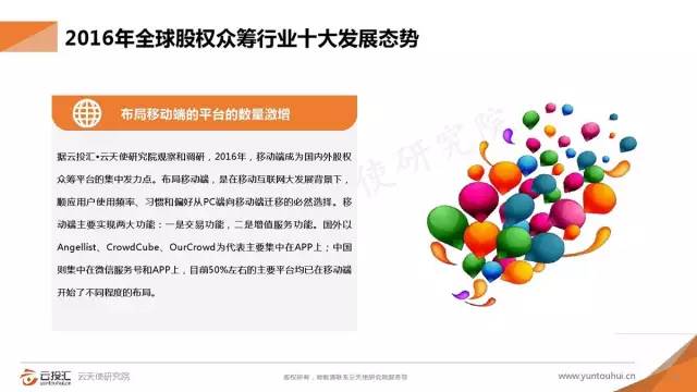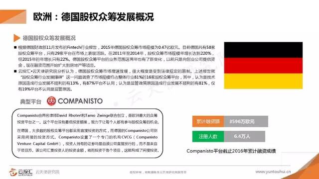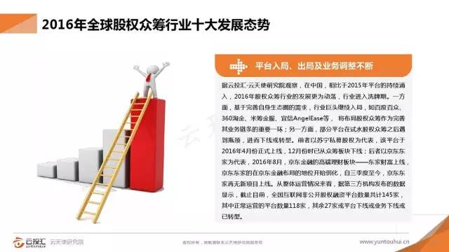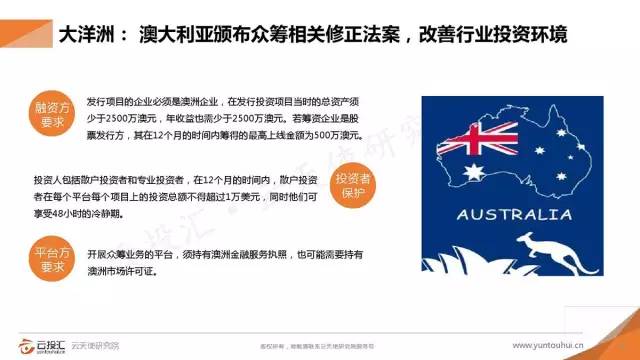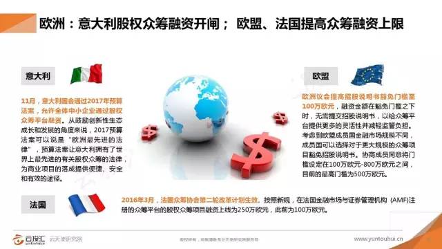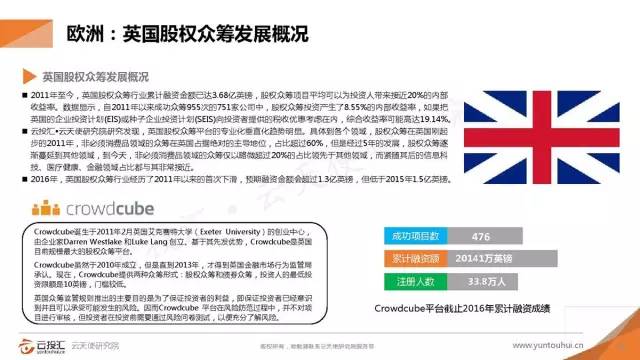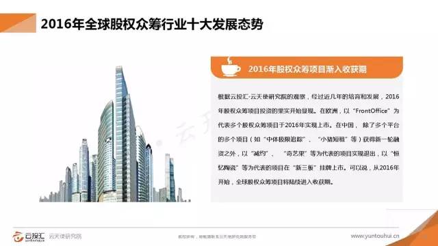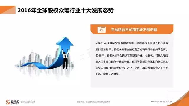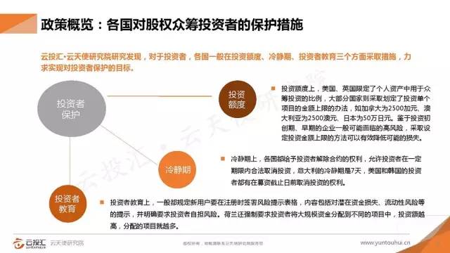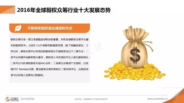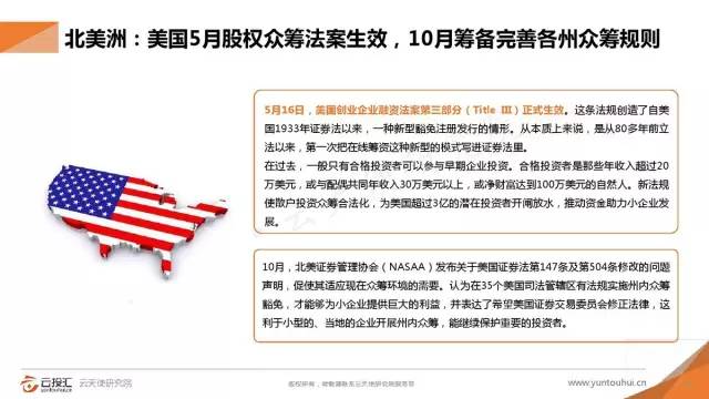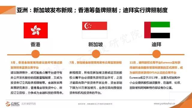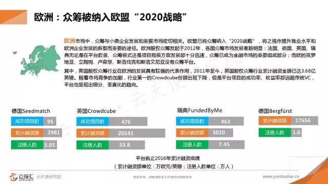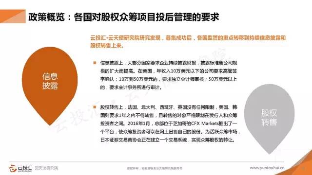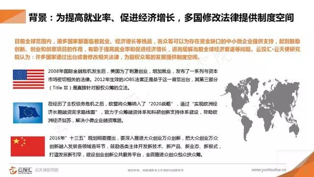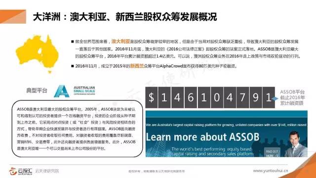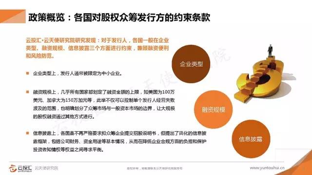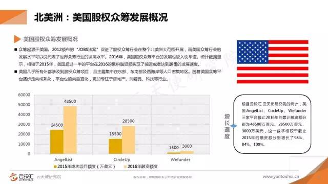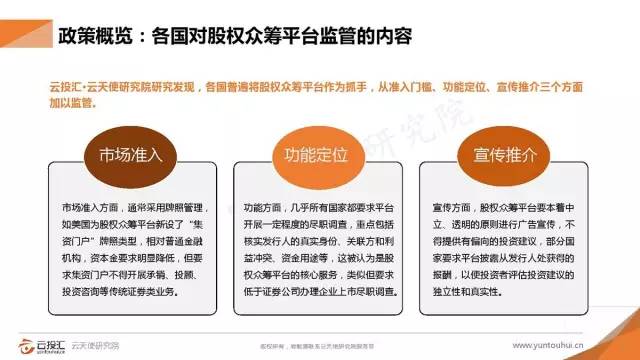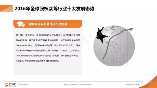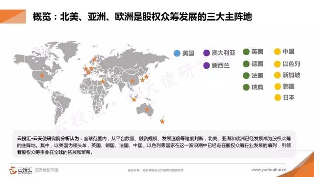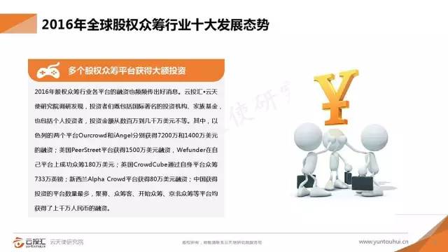 2016年,云投汇·云天使研究院连续发布了“2016Q1中国股权众筹行业发展报告”、“2016Q2中国股权众筹行业发展报告”、“2016年Q3中国股权众筹行业发展研究报告”,“2016年Q4中国股权众筹行业发展研究报告”,“2017互联网众筹行业现状与发展趋势报告”,从行业数据、行业政策、行业新闻和行业创新等多个维度力图全景呈现国内行业发展态势和未来趋势,那全球的发展情况如何呢?云投汇·云天使研究院以世界各国具有代表性的股权众筹平台为案例,从监管政策、发展态势、主要问题、未来趋势等方面切入,呈现了2016年全球股权众筹行业发展态势,预判2017年的发展趋势。