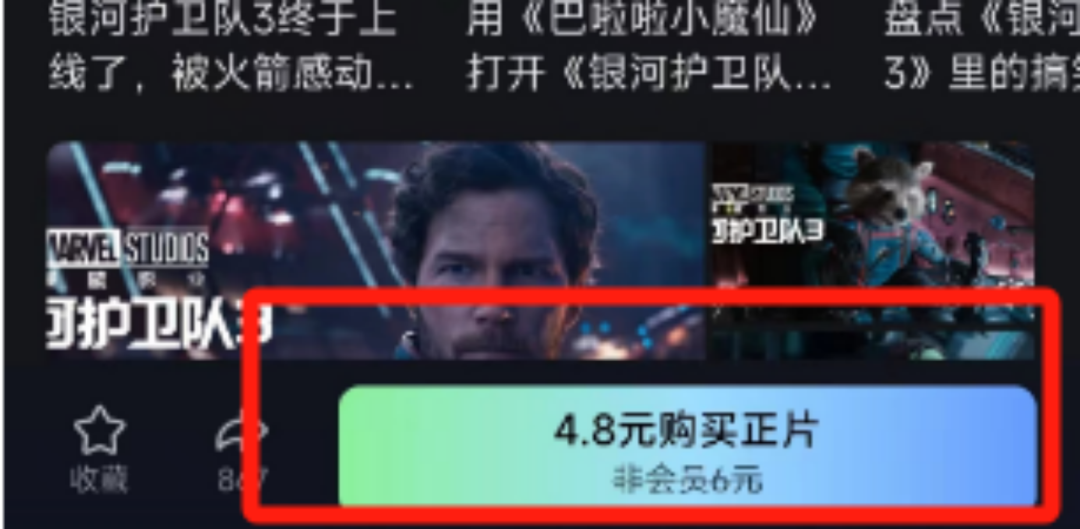 一些热门电影,爱奇艺还有额外的“云影院”,需要额外付费购买。刘宇想看漫威的《银河护卫队3》,点进去才发现,还需要额外再付费4.8元,有效期只有48小时。甚至还需要额外付费。