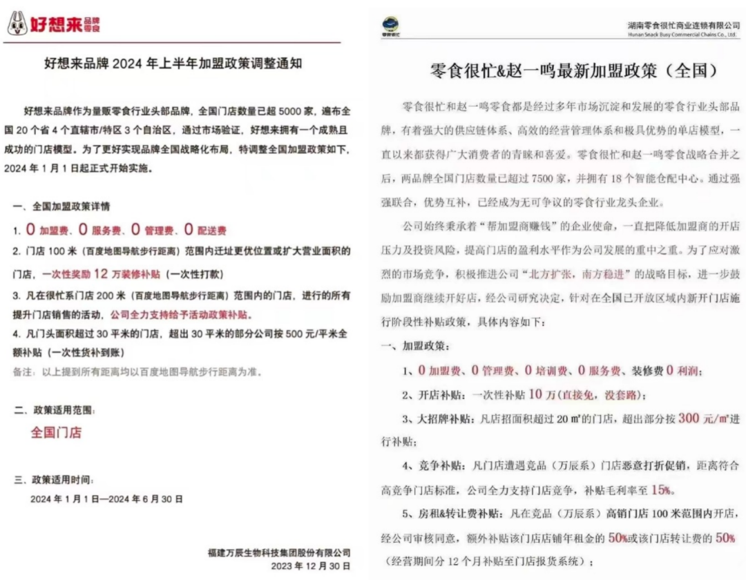 零食很忙最新加盟政策中明确提出,“凡门店遭遇竞品(万辰系)门店恶意打折促销,距离符合高竞争门店标准,公司全力支持门店竞争,补贴毛利率至15%”。