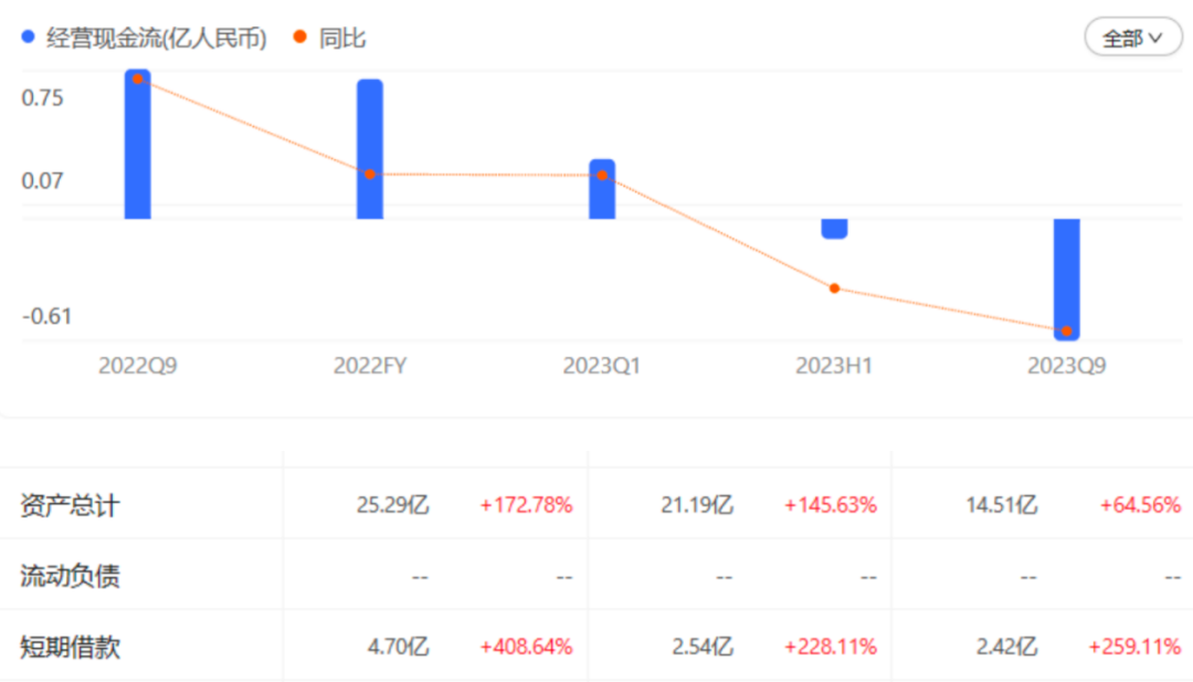 财报显示,截至2023年第三季度,万辰集团的短期借款已达到4.70亿元,资产负债率更是达到了74.86%,经营性现金流为-0.61亿元,入不敷出。