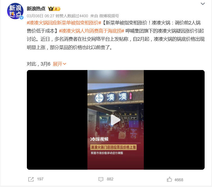 湊湊门店多位于一线、新一线,人均价格在150元以上,媲美海底捞。今年2月,本就够贵的湊湊又陷入涨价争议。#湊湊火锅人均消费高于海底捞#话题登上微博热搜,对此湊湊官方客服回应称,这次调整为按照锅底类型收费,并且上线了小份菜,人越多越实惠。