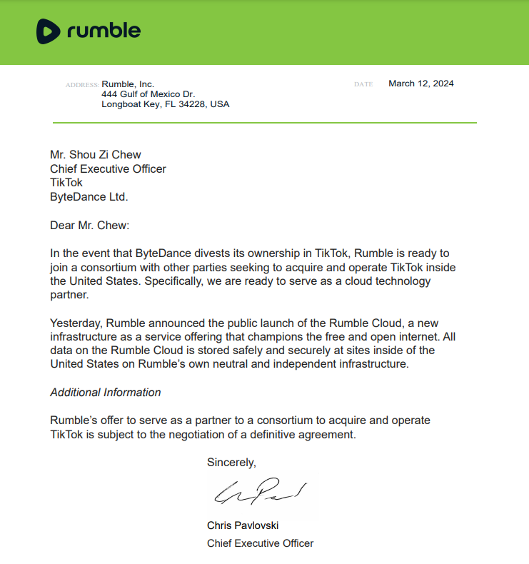 当地时间3月12日,短视频平台Rumble首席执行官克里斯·帕夫洛夫斯基(Chris Pavlovski)在社交平台上发布的一封致TikTok首席执行官周受资的信中称,如果字节跳动剥离对TikTok的所有权,Rumble有意加入一个财团,寻求收购并在美国运营TikTok,Rumble准备成为云技术合作伙伴。帕夫洛夫斯基表示,Rumble近日发布了Rumble Cloud,其上所有数据“都安全可靠地存储在美国境内独立的基础设施中”。
